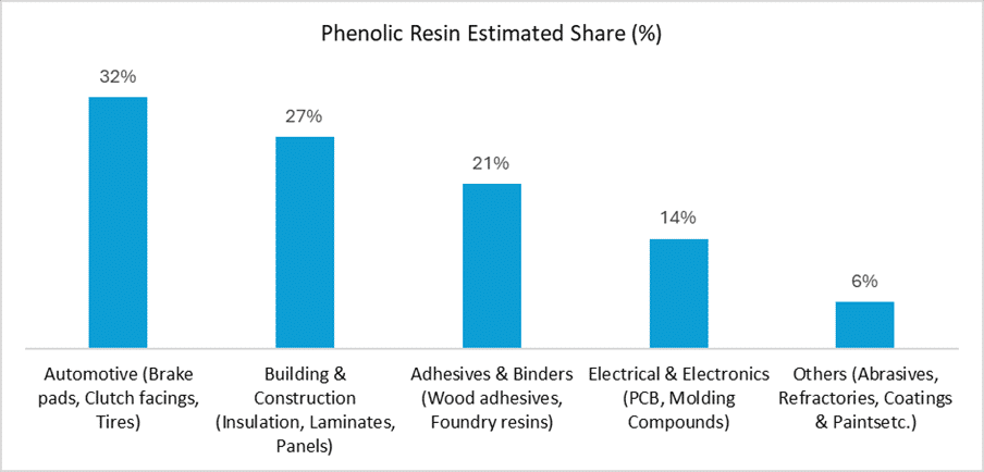 Phenolic resins are produced via the condensation reaction of phenol and formaldehyde and are typically classified into novolac (acid-catalysed, requiring a curing agent) and resol (base-catalysed, self-curing) types, each tailored for specific end-use applications. Phenolic resin prices in the Indian market rose from ₹55/kg in April to ₹62/kg by June 2025, reflecting a 12.7 per cent cost-driven escalation, directly linked to a 4-5 per cent rise in phenol prices. Demand in Q2 2025 was led by the automotive sector (~32 per cent of total consumption), followed by construction (27 per cent), electrical & electronics (21 per cent), and others.