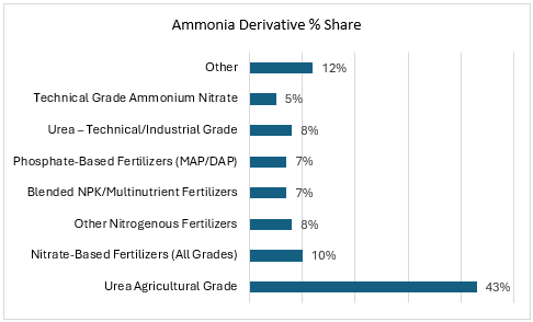 Beyond fertilisers, ammonia also plays a key role in the production of ammonium nitrate, ammonium sulphate, nitric acid, and various industrial chemicals. With rising momentum behind global decarbonisation, ammonia is being increasingly recognised for its potential role as a hydrogen transport medium and emissions-free energy source, especially in marine and energy sectors. This emerging demand is expected to contribute to long-term capacity expansion and new investment in low-carbon (green and blue) ammonia technologies.