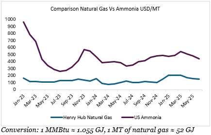 From early to mid-2024, ammonia prices remained relatively subdued, with year-on-year declines ranging from 40 per cent to over 50 per cent in the first quarter. This was despite modest volatility in natural gas prices, suggesting that the ammonia market was still correcting from the high price levels seen in previous years. However, starting in mid-2024, ammonia prices began stabilising and gradually rebounding, as signs of improved agricultural demand emerged. Natural gas prices also began to rise again toward the end of 2024, influencing ammonia cost structures.