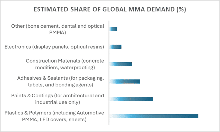 Methyl Methacrylate (MMA), a vital acrylic monomer used in the production of polymethyl methacrylate (PMMA) and various coatings, adhesives, and resins, continues to play a significant role across diverse downstream industries. In 2024, global demand for MMA has surpassed 3.4 million metric tons, and the market is projected to expand at a Compound Annual Growth Rate (CAGR) of approximately 4.5 per cent. By 2030, global consumption is anticipated to exceed 4.7 million metric tons, driven by steady demand recovery in key sectors such as construction, automotive, and electronics and others.