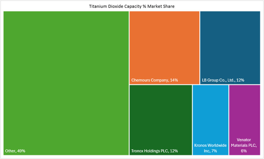 In North America, Chemours controls roughly half of the region’s total TiO₂ production capacity, making it the dominant competitor. LB Group has announced its intention to add approximately 200,000 tonnes of chloride process capacity, which will be introduced progressively over the next several years.