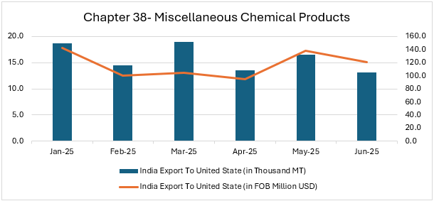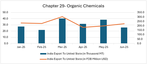 Exports to the US fluctuated in volume (22.1–40.5 thousand MT) and value (182.4–303.9 million USD) during Jan–Jun 2025. March saw the peak in both tonnage and value, while April–June reflected weaker realizations despite moderate volumes. End-use industries impacted include pharmaceuticals, agrochemicals, plastics & resins, food & beverages, construction chemicals, and industrial solvents due to weak demand. |