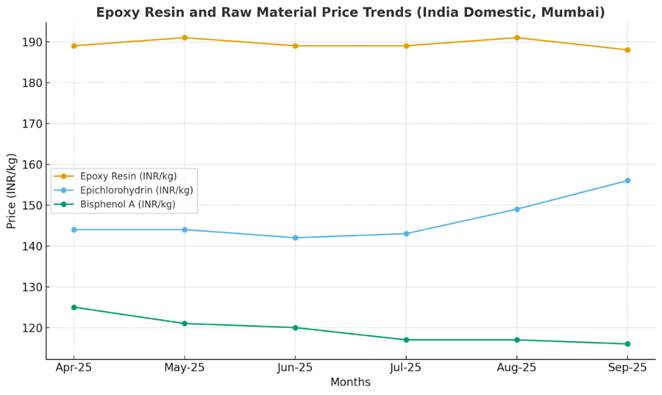 Epoxy Resin prices in the Indian domestic market (Mumbai) remained relatively stable in the period April–September 2025, fluctuating only within a narrow band of ₹188–191/kg. This stability is largely attributable to a balancing effect between the cost trends of its two critical raw materials Bisphenol A and Epichlorohydrin.