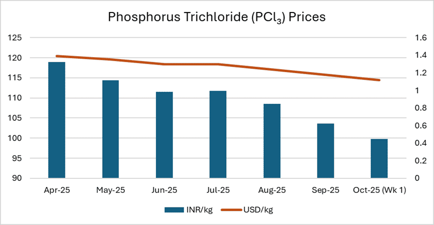 Phosphorus Trichloride (PCl₃) prices in the Indian domestic market (Mumbai) recorded a consistent downward trend from April to October 2025, declining by approximately 16 per cent. Prices fell from ₹118.9/kg ($1.39/kg) in April to ₹99.75/kg ($1.12/kg) in the first week of October. The decline reflects easing feedstock costs, reduced international demand, and higher export availability.