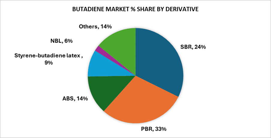 Butadiene is a cornerstone intermediate for the synthetic rubber and thermoplastic sectors. Roughly 60 per cent of global demand goes into the manufacture of polybutadiene (PBR) and styrene-butadiene (SBR) rubbers, both essential in tire, automotive, and mechanical-goods production.