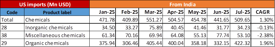 Total US imports of chemicals from India show a modest upward trend, growing from $471.78 Mn in Jan-25 to $509.65 Mn in Jul-25, with a CAGR of 1.30 per cent.