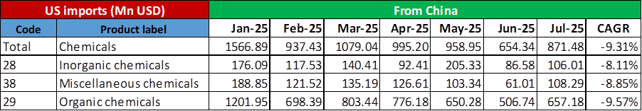Total US imports of chemicals from China show a steep decline from $1566.89 Mn in Jan-25 to $871.48 Mn in Jul-25, with a CAGR of -9.31 per cent.