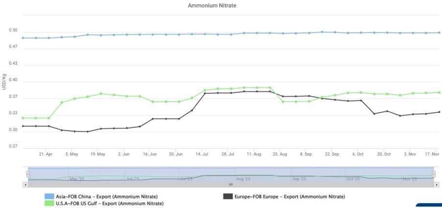 Ammonium nitrate (AN) pricing exhibited clear regional divergence between April and November 2025, driven primarily by feedstock cost variability, differing supply demand balances, and localised logistics dynamics: