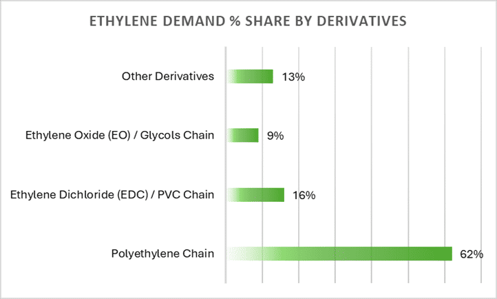 More than 60 per cent of global ethylene is directed to the polyethylene chain, making it the single largest derivative sink. This includes: