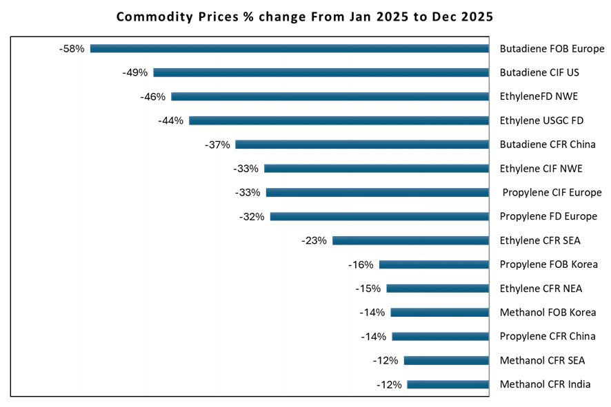 Feedstock chemical markets remained under sustained pressure throughout 2025, with prices trending lower across all major products and regions. Between January and December, prices for ethylene, propylene, butadiene, and methanol declined by approximately 12 percent to nearly 60 percent. These declines were driven by weak global demand, ongoing oversupply, lower energy prices, and elevated uncertainty related to trade and policy developments.