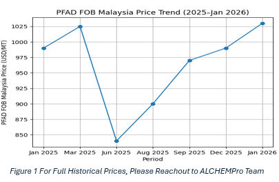 PFAD prices in 2025 were influenced by upstream crude palm oil availability, biodiesel blending dynamics, and downstream demand from soaps, oleochemicals, and feed sectors. High CPO supply and steady refinery run rates increased PFAD output, while biodiesel mandates continued to support CPO prices rather than PFAD directly. As downstream demand weakened mid-year, PFAD prices fell more sharply due to oversupply. In the second half, tighter palm oil supply, improved biodiesel sentiment in the palm complex, and higher downstream operating rates supported recovery. This cycle highlighted PFAD’s higher sensitivity to combined supply, biodiesel policy, and end-use demand shifts.