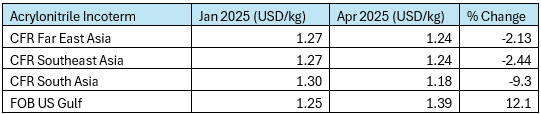 A notable trend in early 2025 was the strong performance of the US market compared to Asia. While Asian prices increased moderately, FOB US Gulf Acrylonitrile prices rose significantly due to supply constraints and rising operating costs.