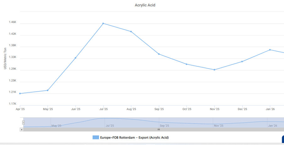 The recovery strengthened in January 2026, when prices rose to around $1370 per metric ton. This surge was primarily supported by propylene prices reaching approximately $983 per metric ton, significantly increasing production costs. Additionally, seasonal restocking and improved demand from superabsorbent polymer and coatings sectors contributed to the upward movement.