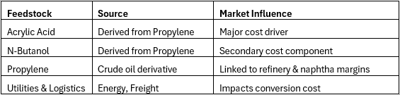 The firmness in propylene prices, supported by elevated crude oil and naphtha benchmarks amid geopolitical tensions involving the United States, Israel, and Iran, has increased production costs across the acrylic value chain. Stable refinery margins and reduced spot availability in the Asian market have further supported upstream petrochemicals, creating a cost-push environment across acrylic esters, including Butyl Acrylate.