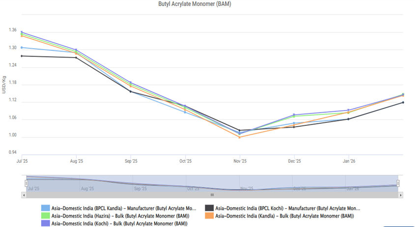 In the near term, Butyl Acrylate prices in India are expected to remain supported by firm feedstock trends, particularly rising crude oil and propylene prices amid geopolitical tensions involving the United States, Israel, and Iran. However, further price gains will depend on continued strength in acrylic acid and propylene and limited import pressure from Northeast Asia.