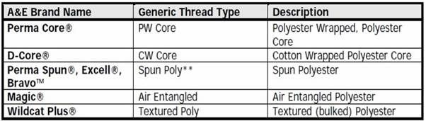 Is made by spinning a wrap of staple cotton or polyester around a continuous filament of polyester fibers. Afterwards, two or more of these single yarns are twisted together to form the thread. Core threads have fuzz on their surface giving them good lubricity characteristics and also a continuous filament core that contributes to high strength and durability. When wrapped with a cotton wrap, core threads have very good needle heat resistance. When wrapped with a polyester wrap, core threads have excellent chemical resistance and colorfastness. Core threads are used in everything from fine blouses to heavy coveralls and overalls. (Example products are D-Core and PermaCore.)