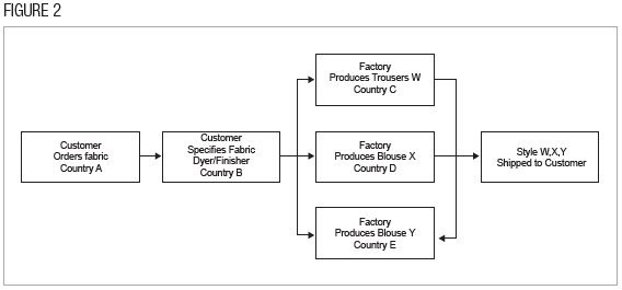 The process changed when the customer took over from the factory to source and negotiate the fabric and trim directly with the suppliers. This provided both lower cost and better-quality control. The customer could place the material order at one location and produce the garment orders, even in the case of matching coordinated garment sets, in many locations in different countries. This ensured that material colours would be uniform, while the garments would be produced in the factories of choice (with the lowest FOB cost) regardless of country (Figure 2).