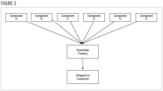 Sourcing hardgoods, such as computers, cell phones and automobiles became even more complex, as customers sourced components at different locations, often in different countries and moved the pieces to a central location for assembly (Figure 3). The problem is that if any single component arrives at the assembly factory late, the entire process is delayed.