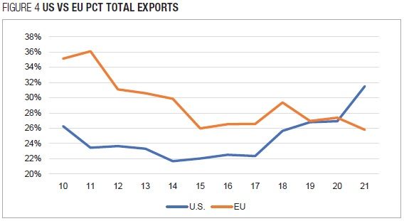2. Less reliance on the big-two importers: As we can see from Figure 4, as of 2021 the US accounted for 31.5 per cent and the EU 25.8 per cent of India’s garment exports.