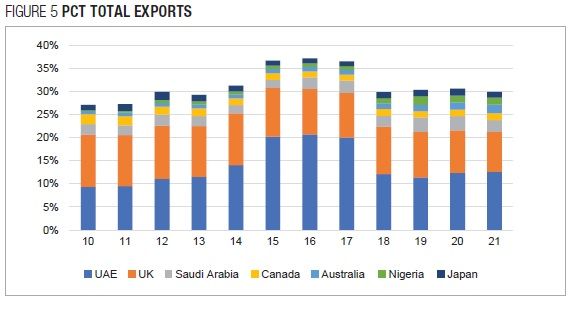 3. Diversified import customer base. Every garment exporting country talks about the need to diversify by adding customers in new importing countries. India is one of the very few success stories. As we can see from Figure 5, India’s second tier import customers account for a steady 30 per cent of its total garment exports. When we consider the geography, with the exception of the UK, India enjoys good proximity to its customers which will minimise the effects of the logistics crisis on exports to these countries.