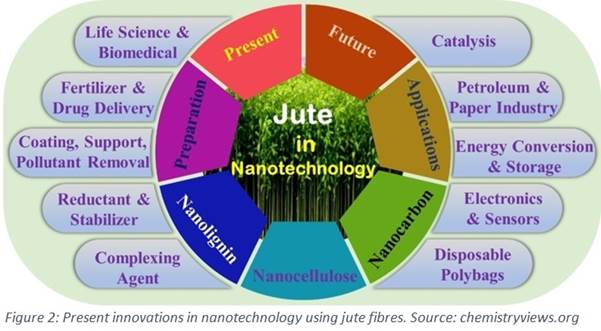 • Use of nano-technology in jute processing: Jute fibres are being processed using nanotechnology to increase their durability, tensile strength, and moisture resistance (Fig.2).