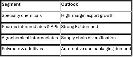• Specialty chemicals and pharma intermediates are likely to lead growth as EU buyers diversify supply chains.